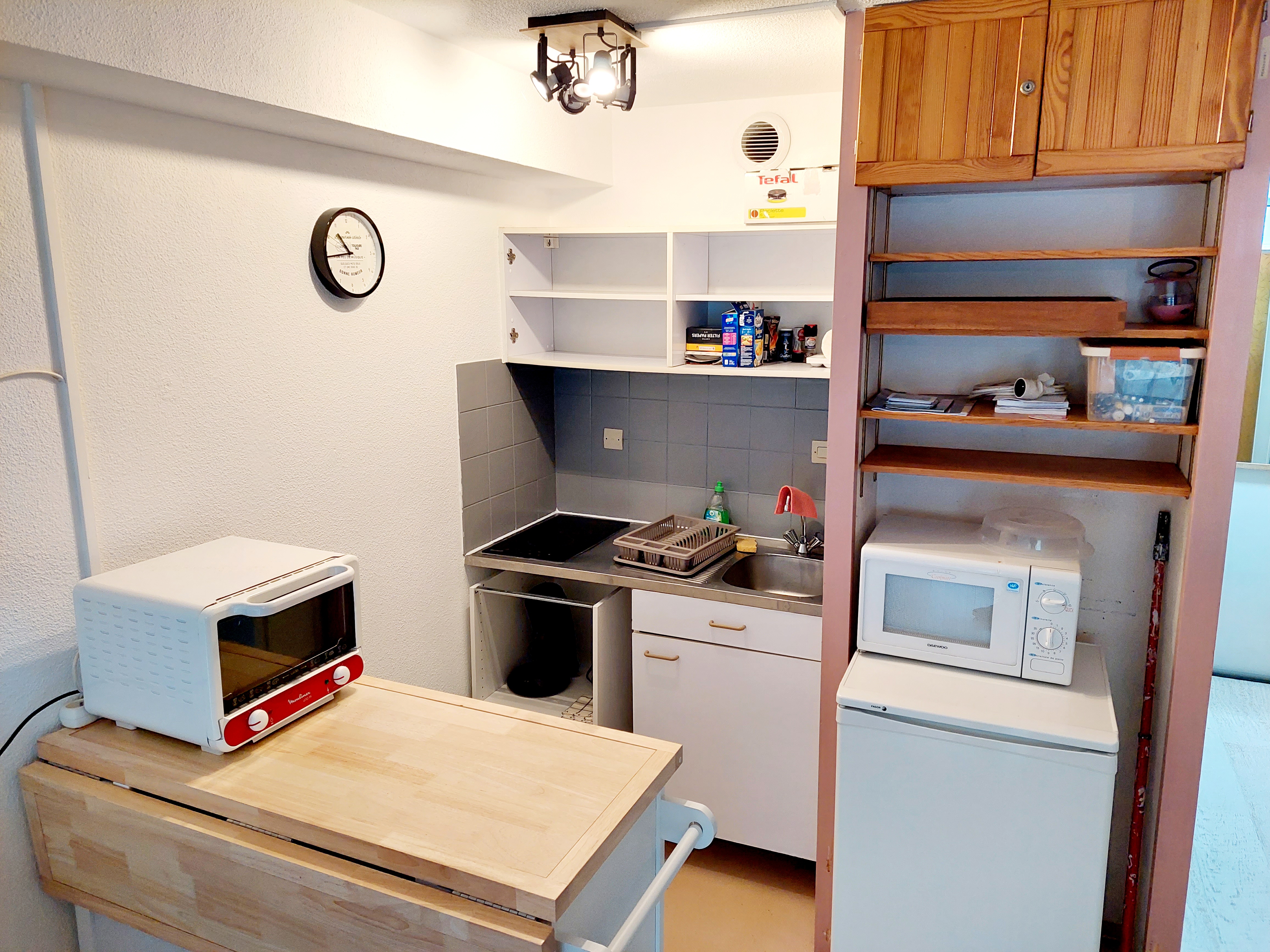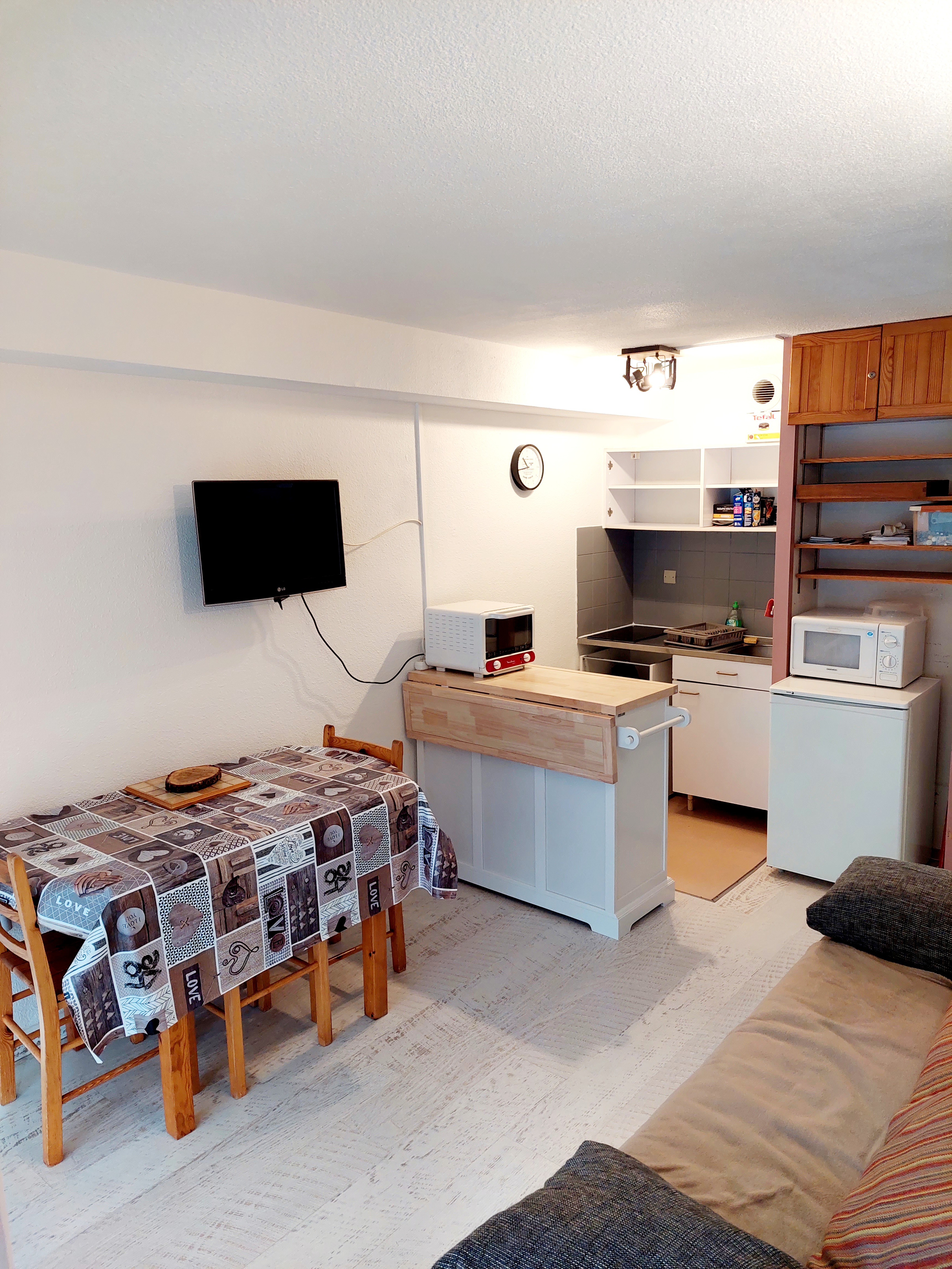 Séjour-Cuisine : réfrigérateur top, une plaque de cuisson électrique 2 feux, four électrique, four micro-ondes, des placards, une cafetière SENSEO, un grille pain, une bouilloire etc… et toute la batterie de cuisine nécessaire. Une table et 4 chaises, un canapé convertible, un écran LCD, des jeux de cartes et de société, un aspirateur, rehausseur sur demande, nécessaire de ménage et rangements. Chauffage électrique neuf.