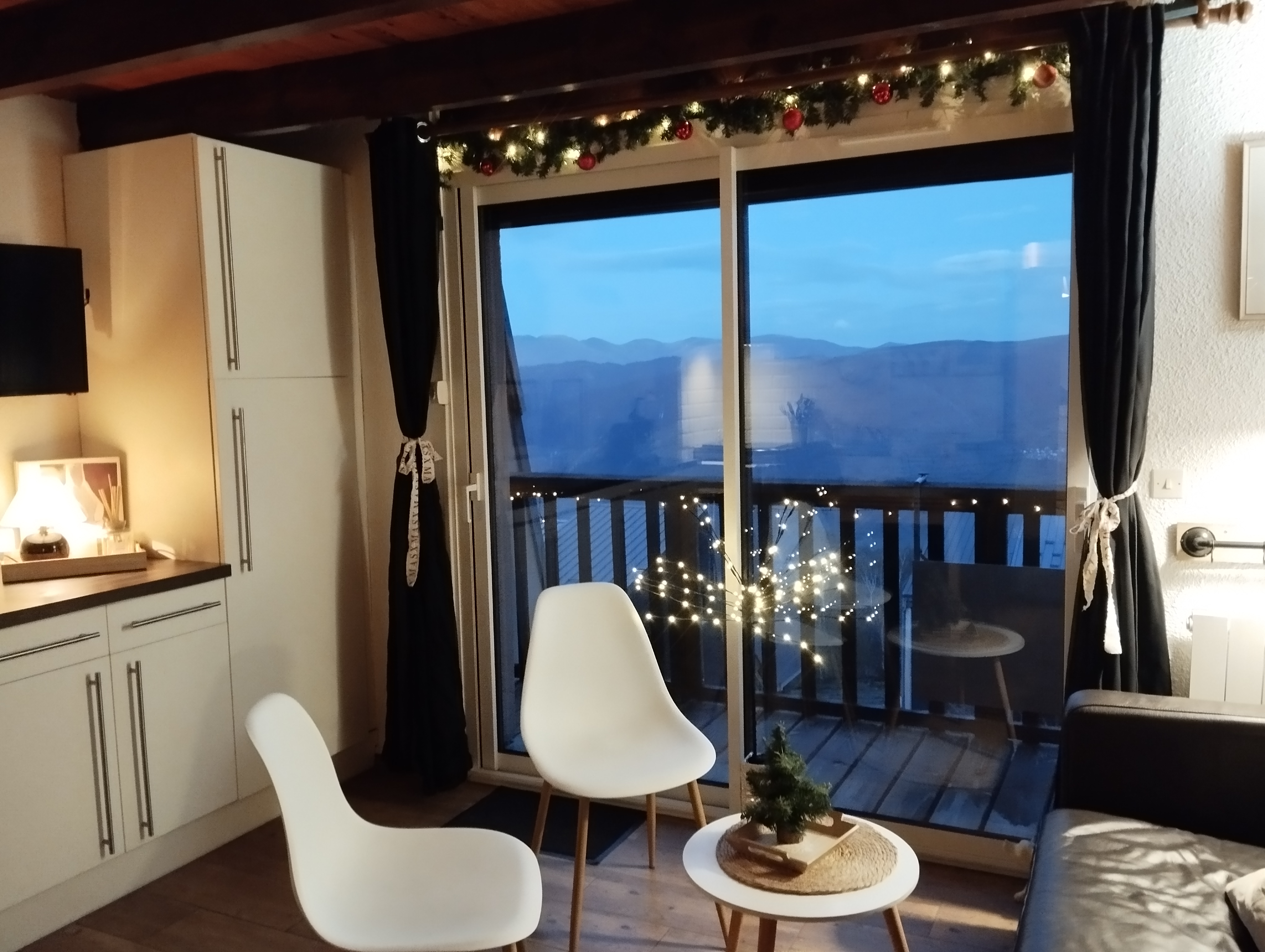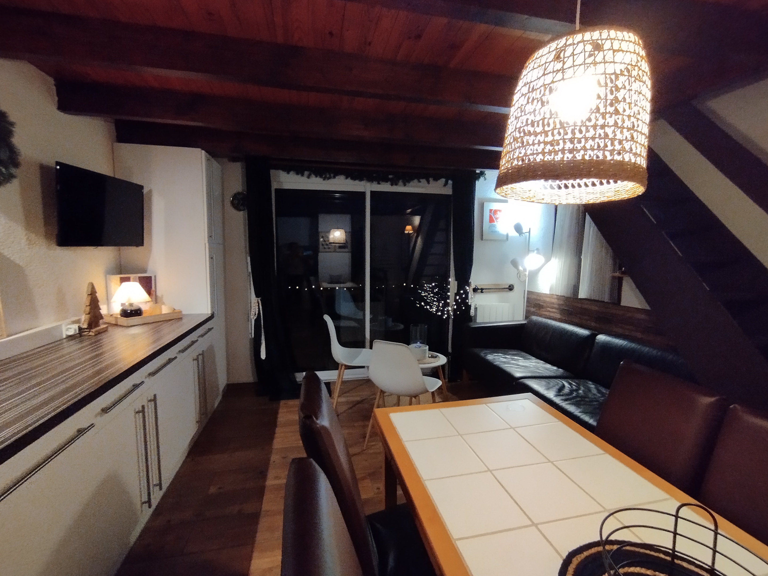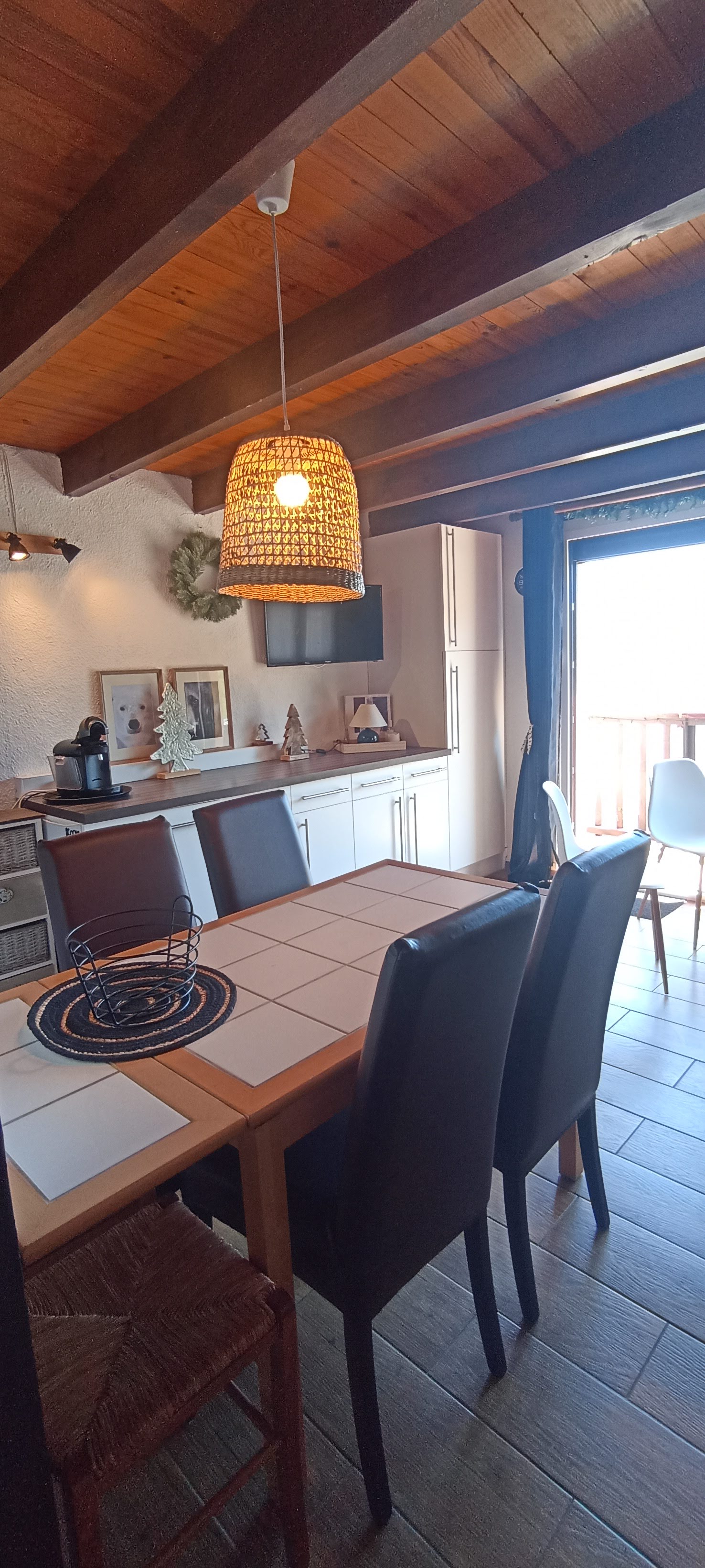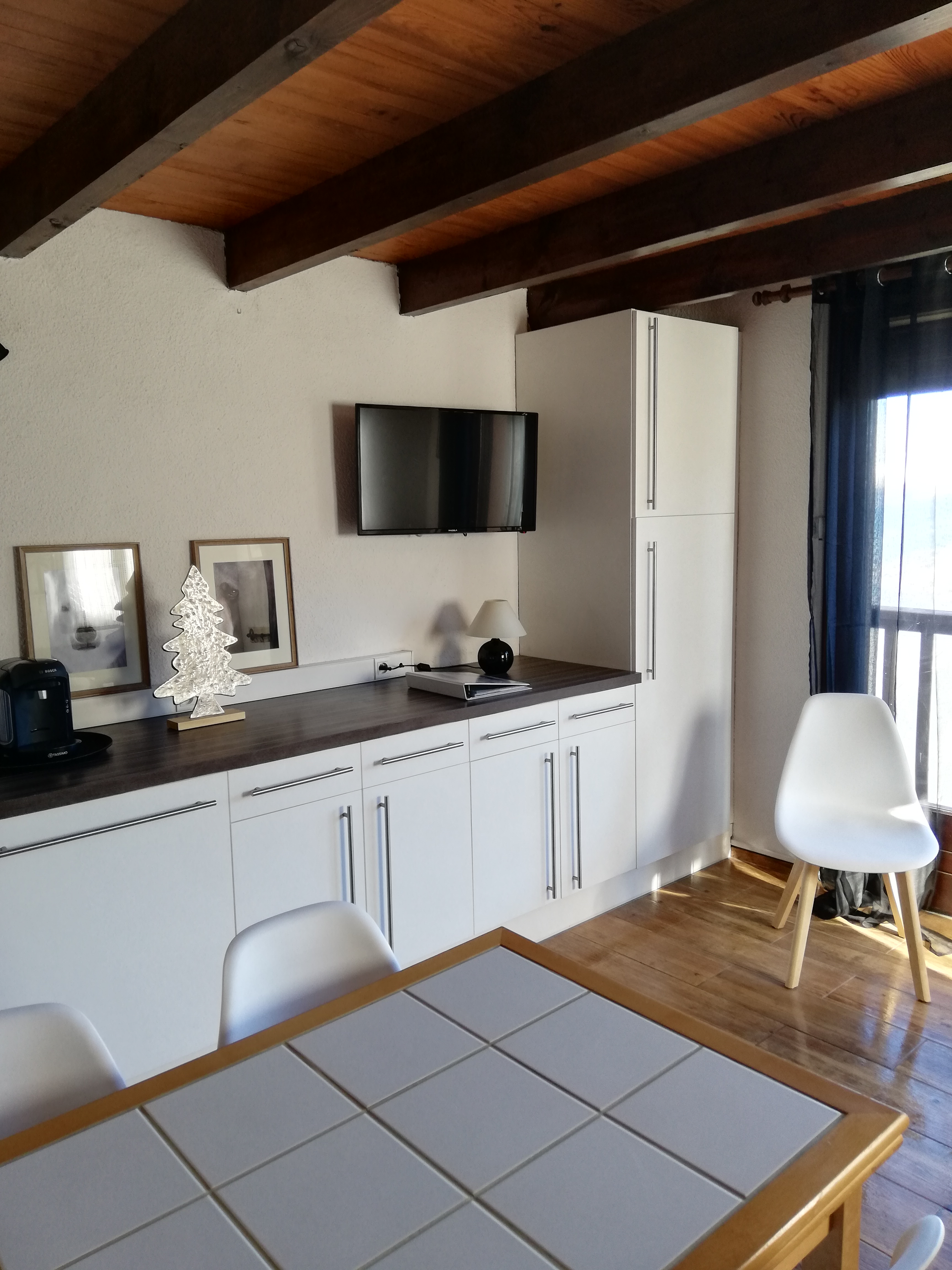 Séjour avec cuisine équipée...(frigo, lave-vaisselle,cafetière filtre et cafetière Tassimo four micro ondes et four traditionnel , raclette et fondue électriques, machine à croques, ....)