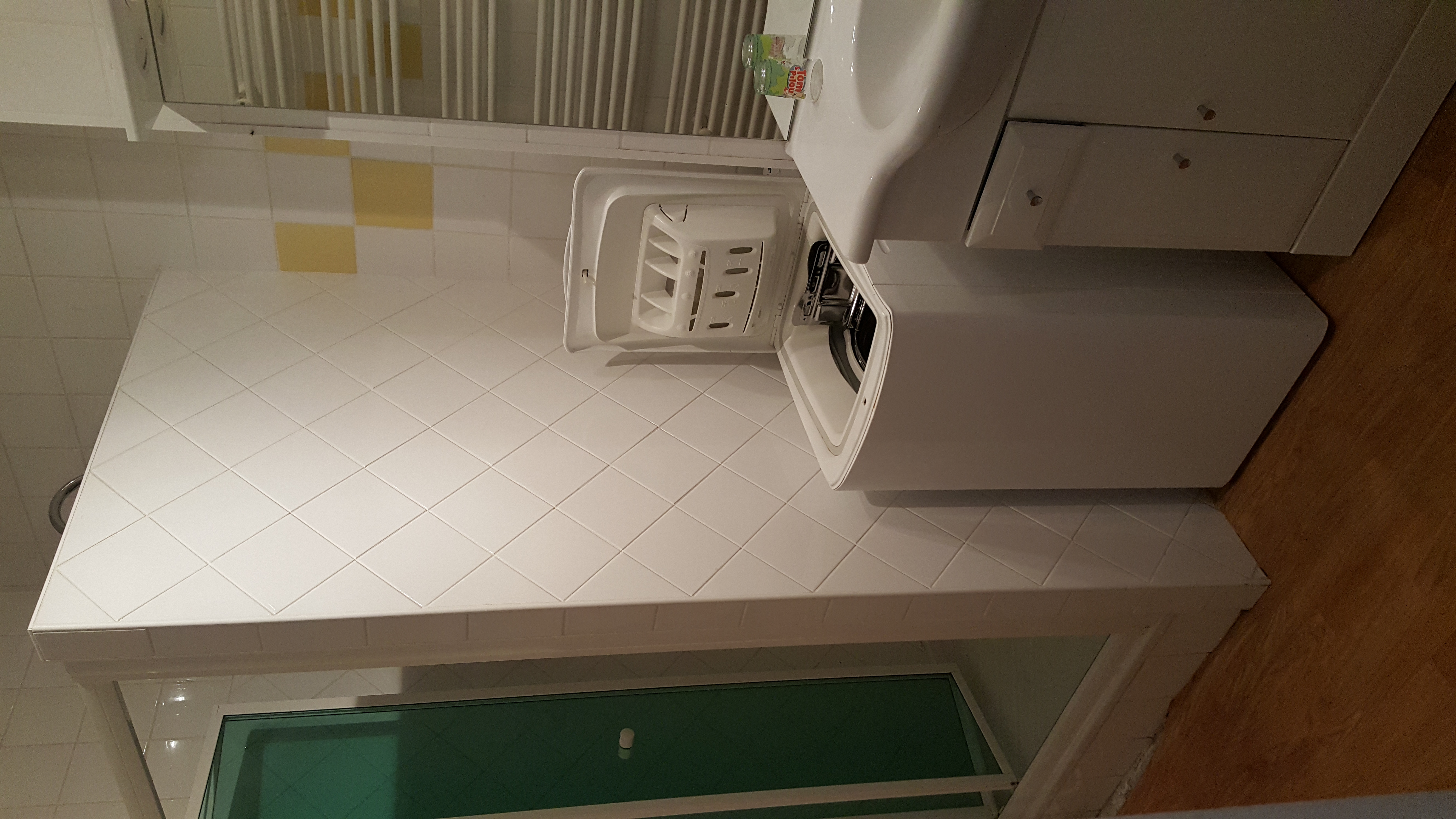 une salle d'eau avec chauffe serviette et machine à laver