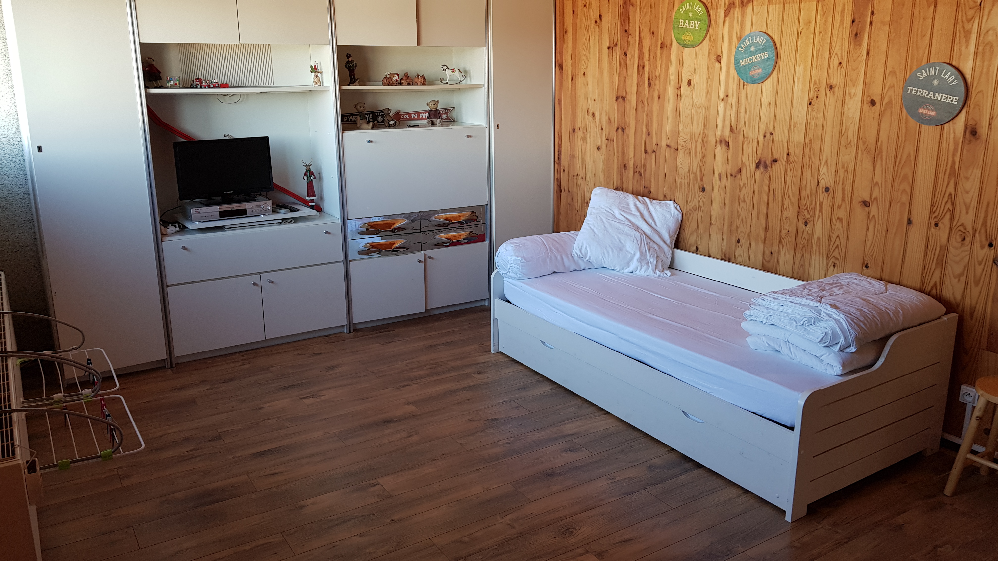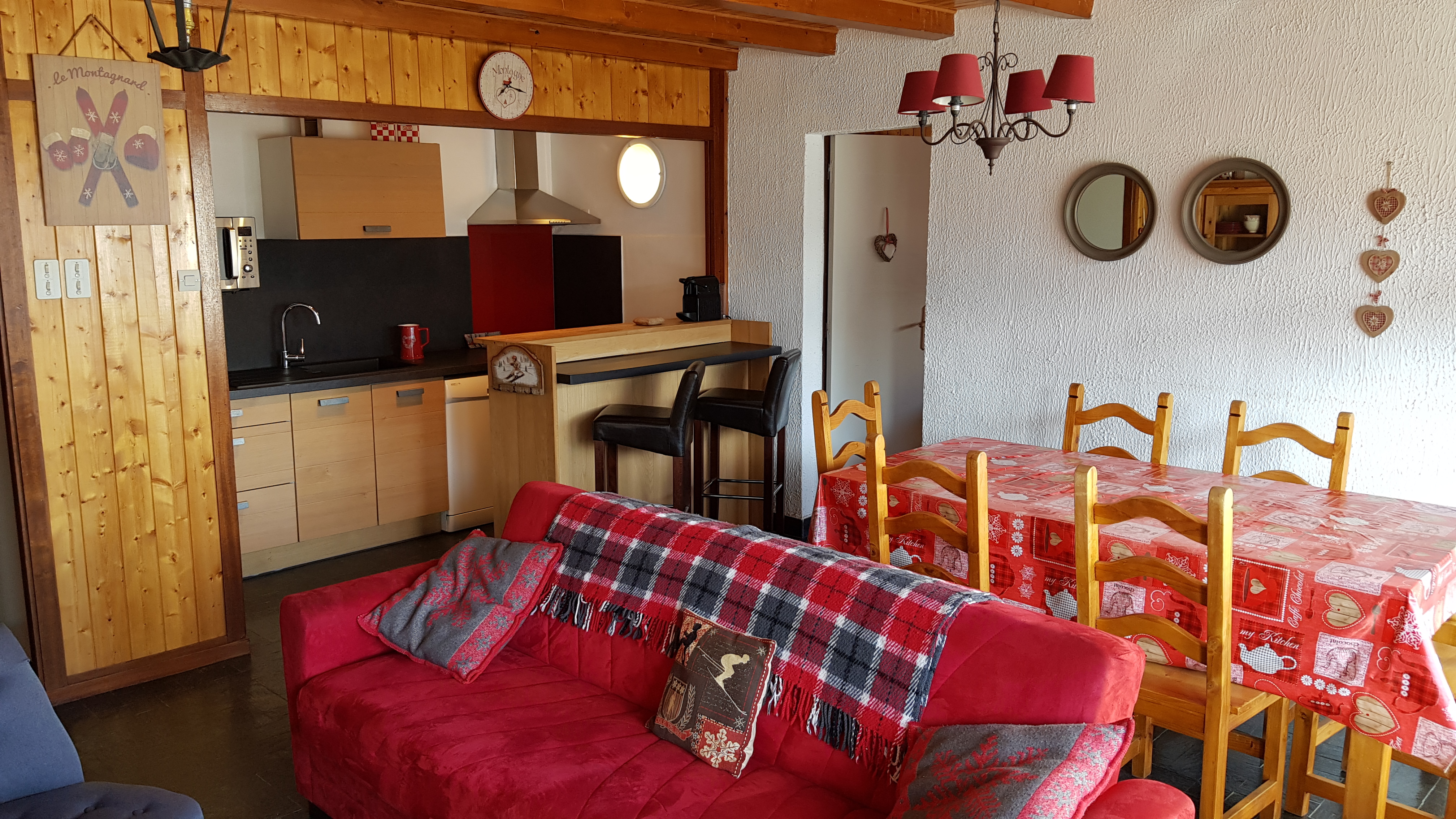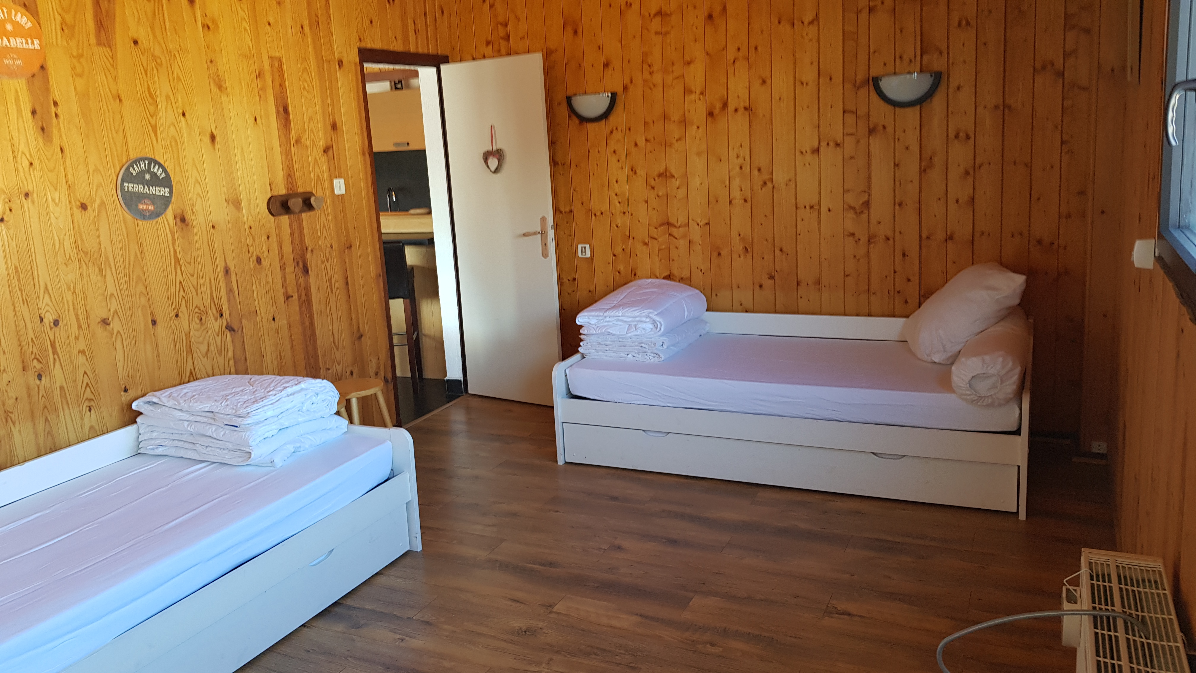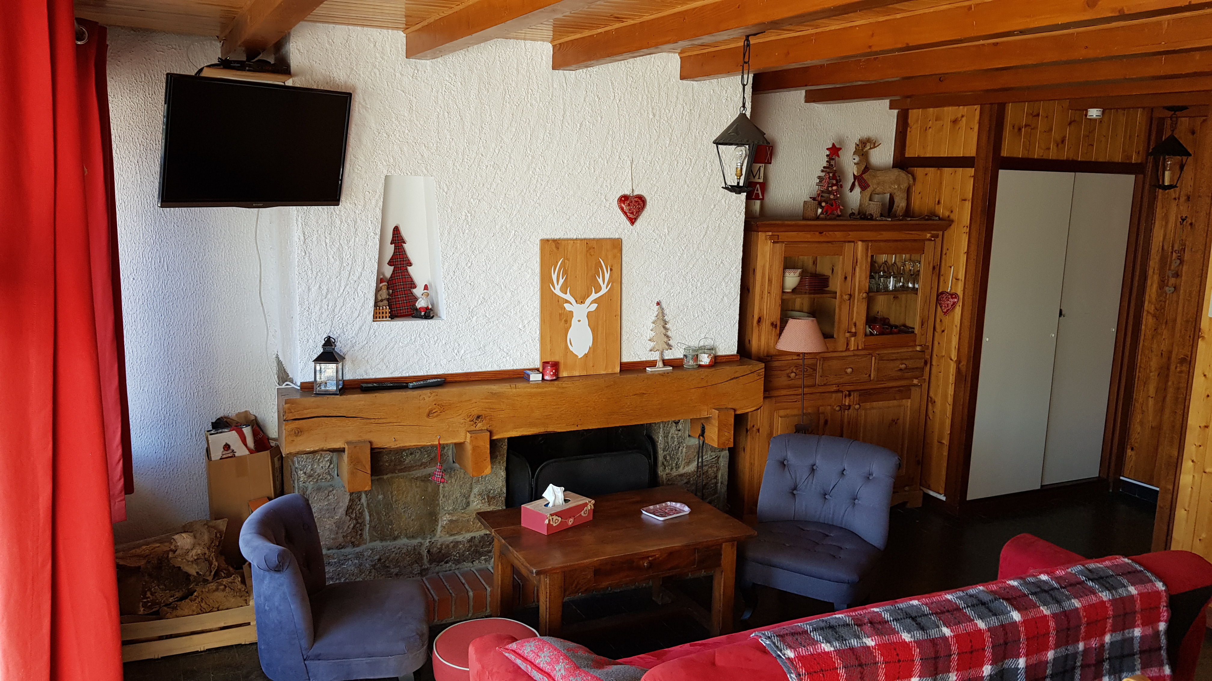 · 2ème niveau : cuisine équipée avec bar, séjour (table 8 personnes), salon (TV, table basse, canapé et fauteuils), cheminée, chambre 3 (très grande de 25m² avec 2 lits gigognes de 4 couchages en 90, TV, lecteur DVD, rangements)