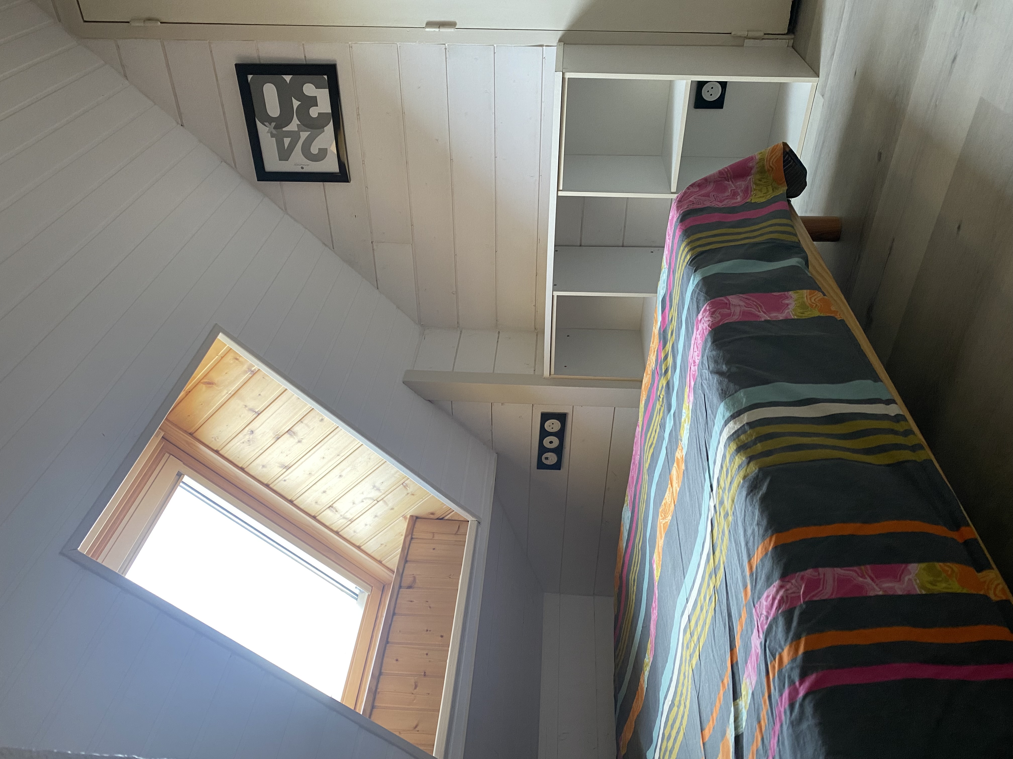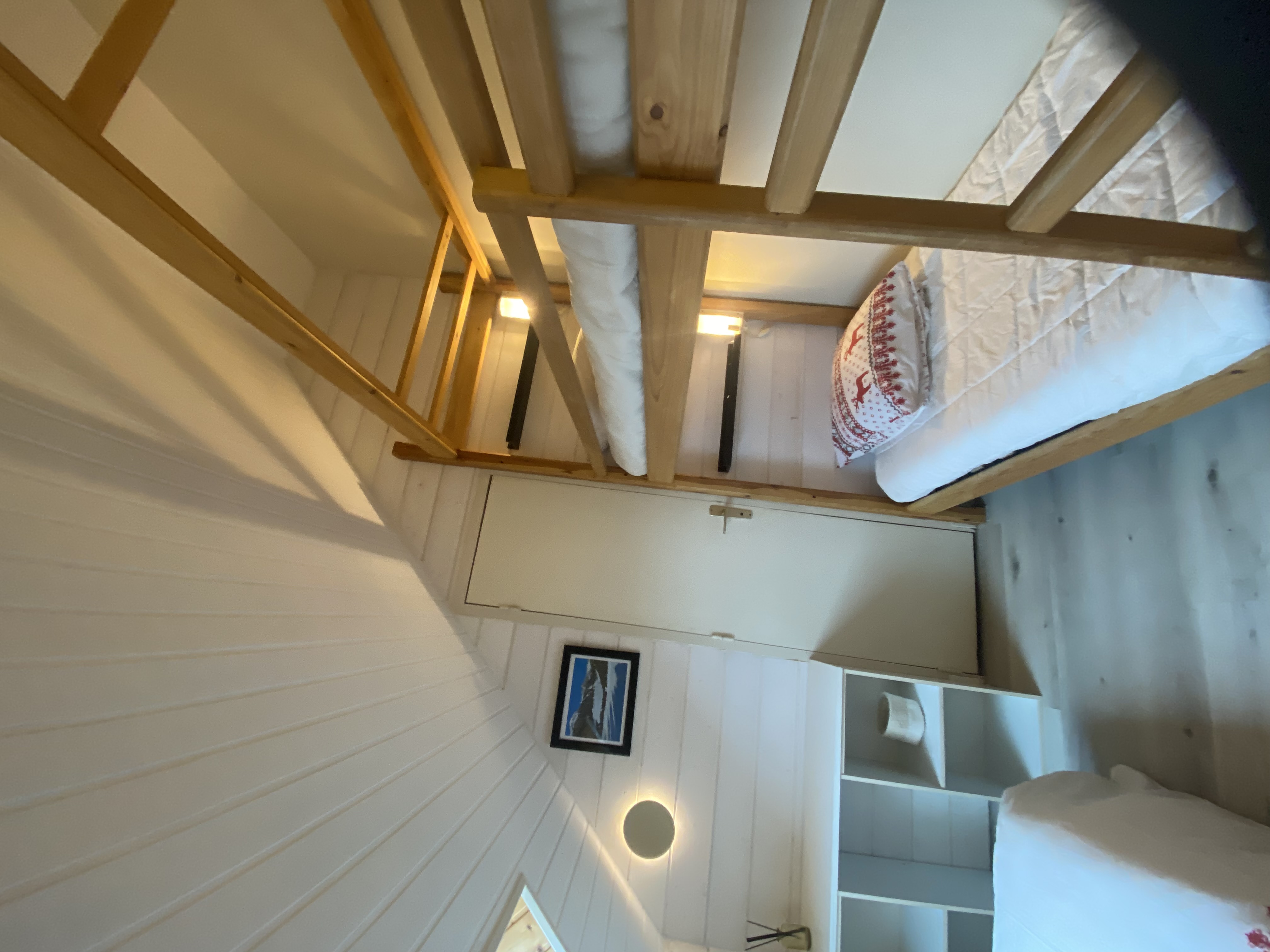 A l’étage, une chambre avec un lit 160 x 190, un lit superposé de 90 x 190. Salle de bains indépendante avec cabine de douche. Les couettes et couvertures ainsi que les oreillers sont fournis. Prévoir draps et linge de maison.