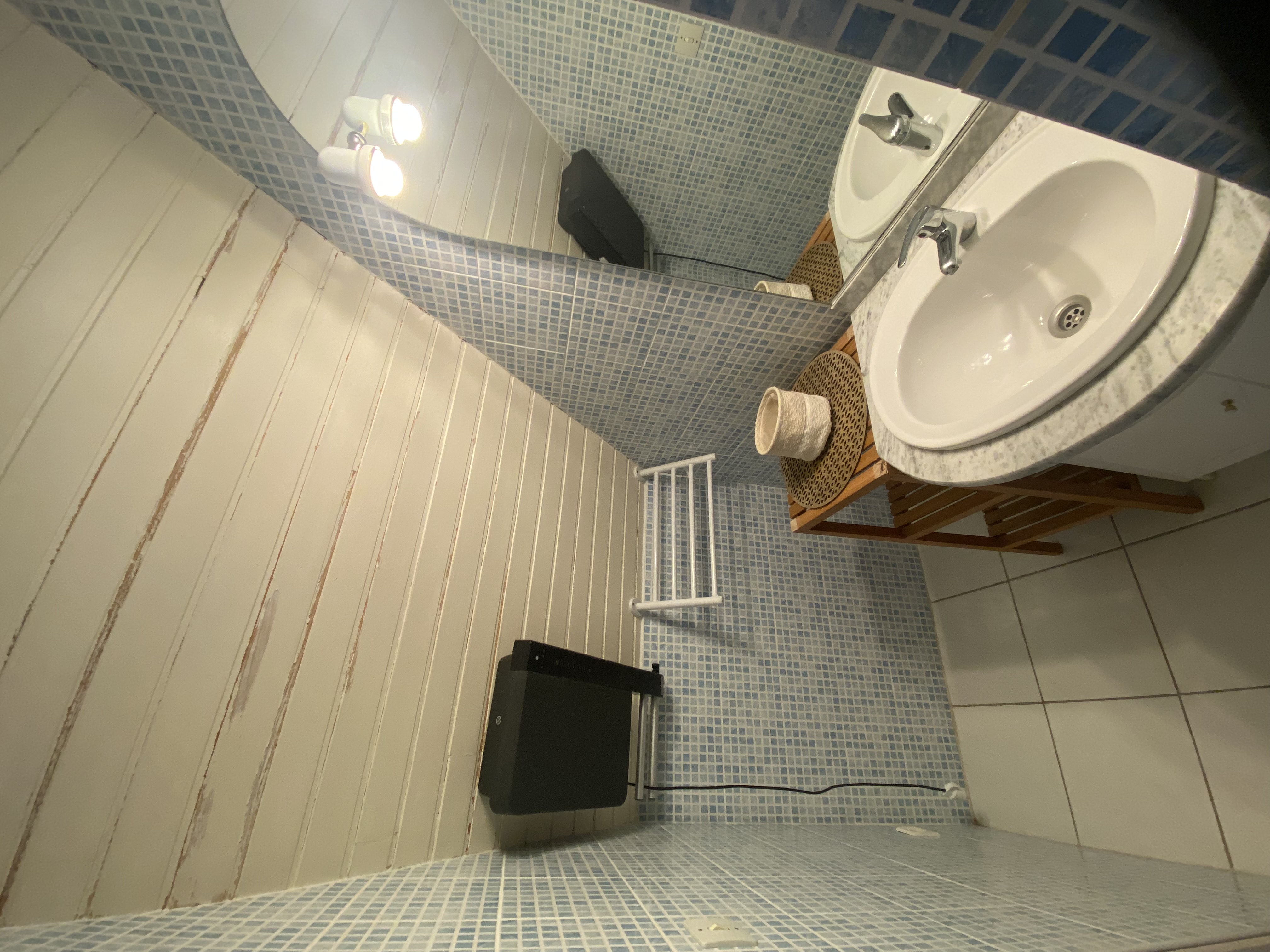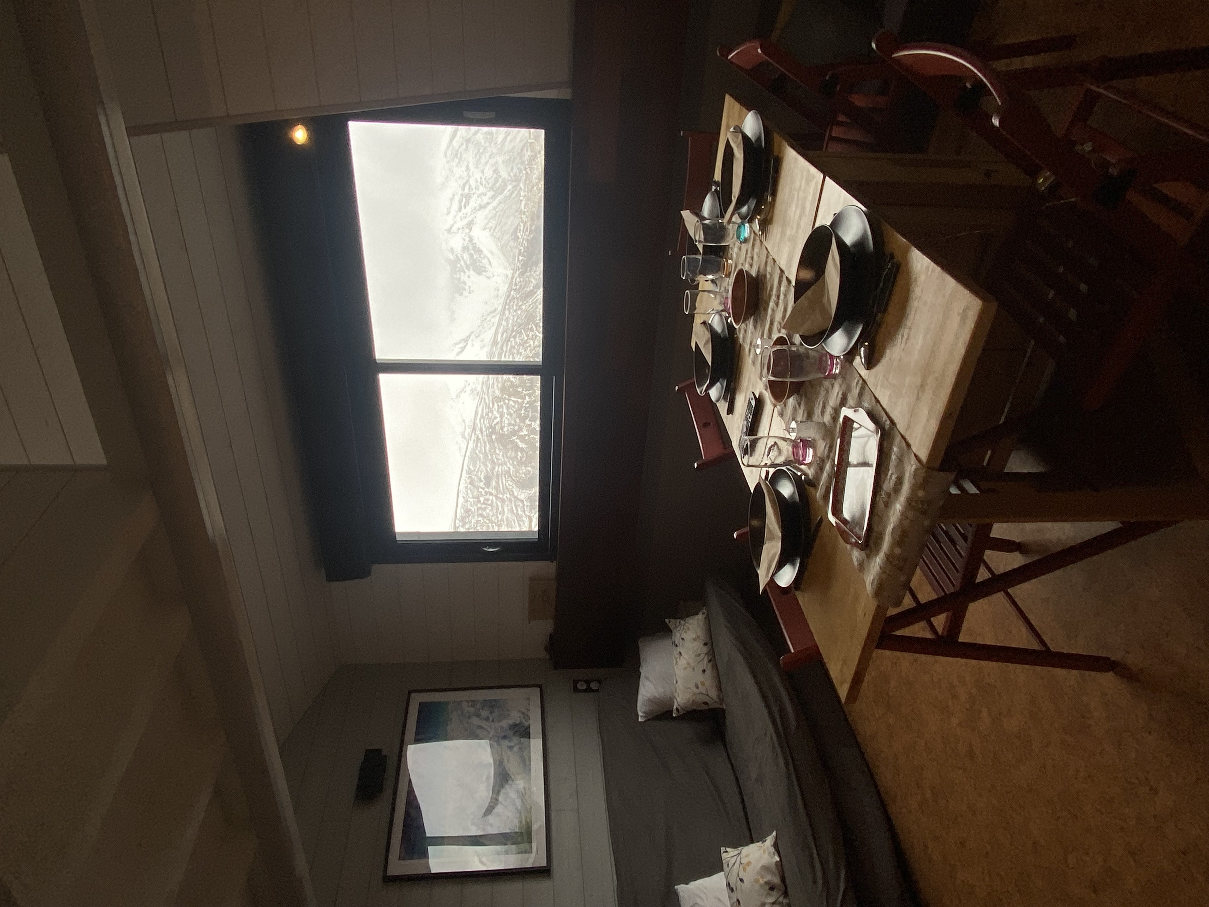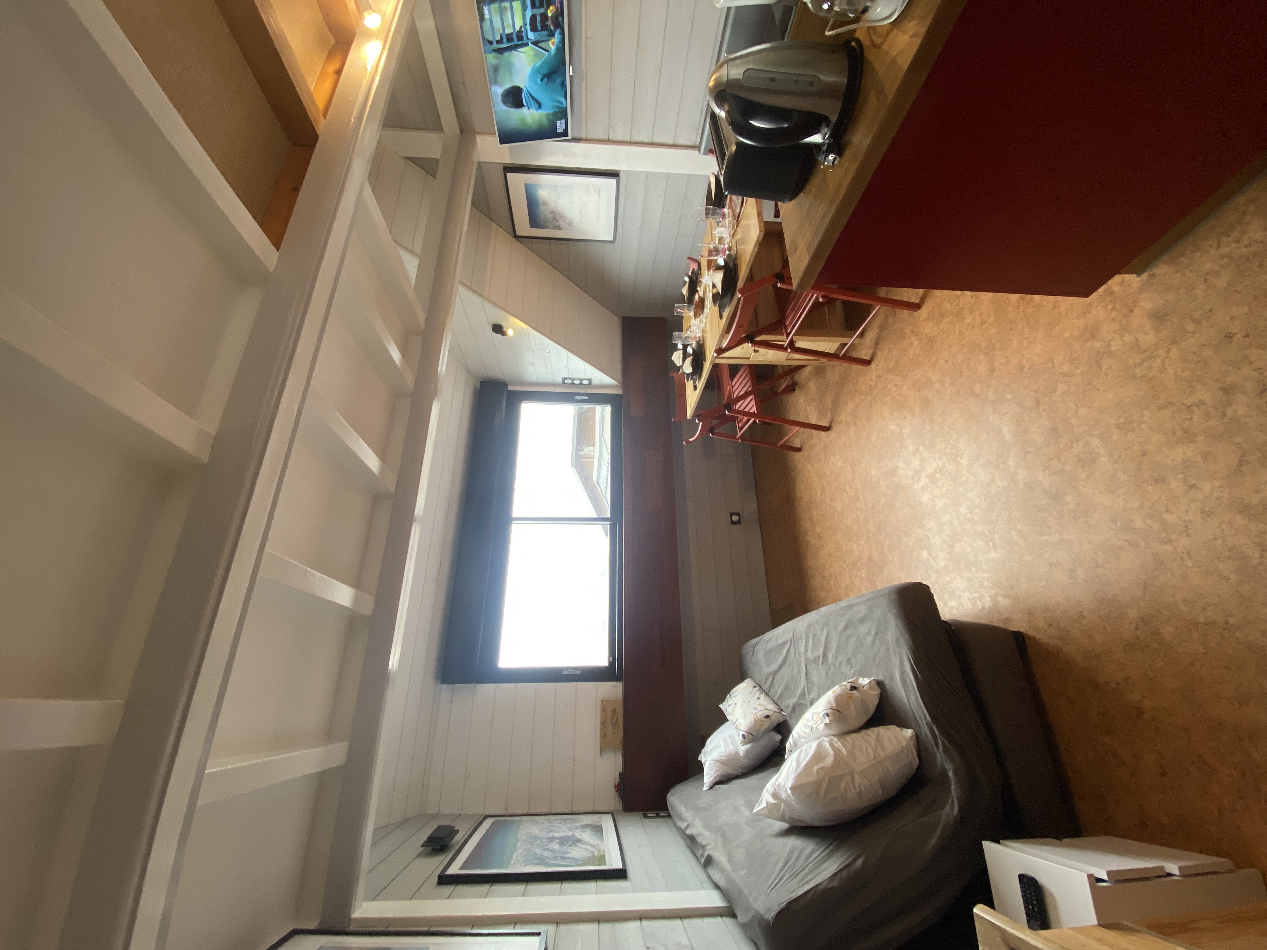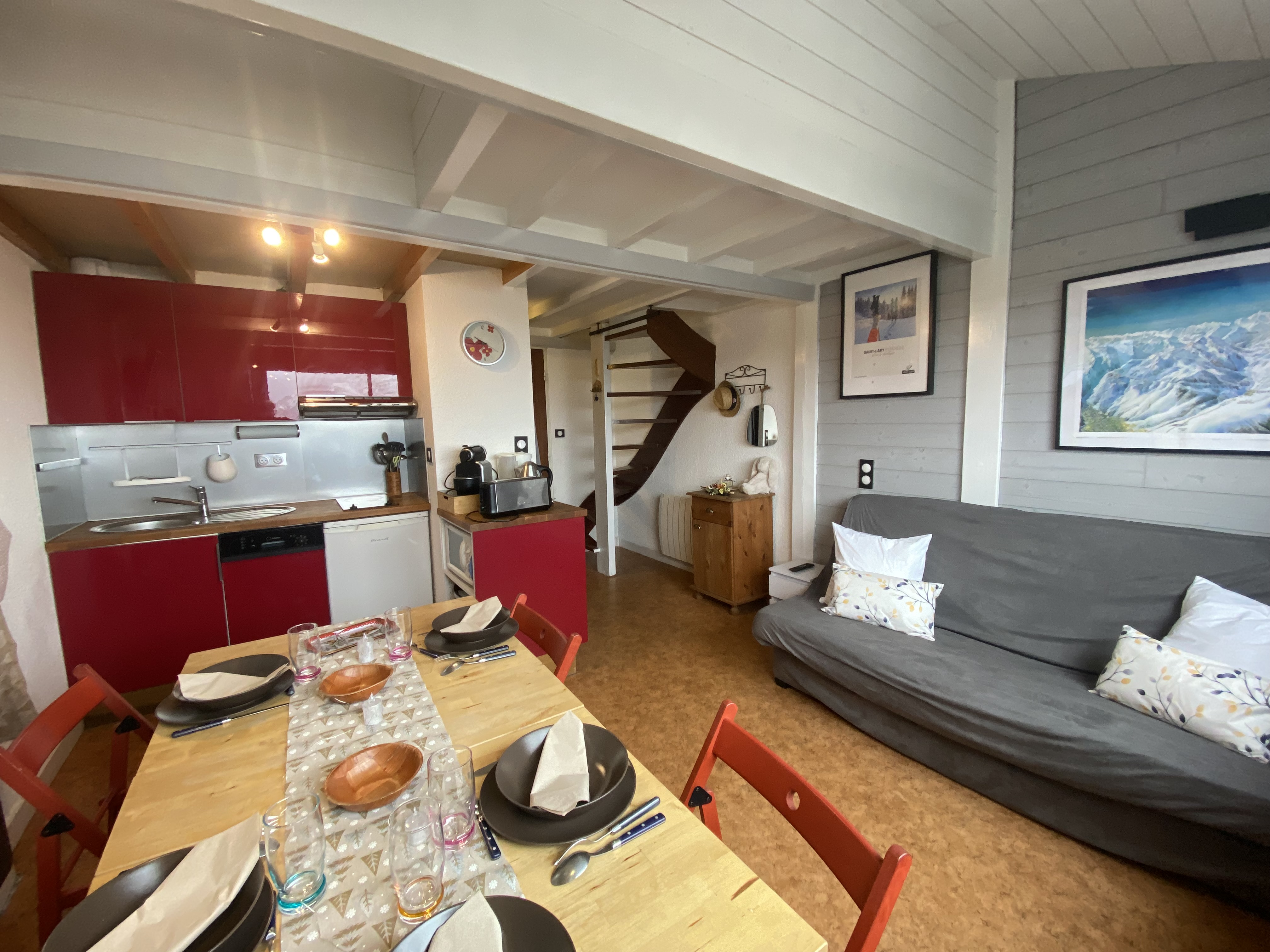 Entrée, WC, placard, salon, cuisine. Dans le salon, canapé clic-clac, écran lcd, jeux de société et console de jeux, table et chaises. Cuisine équipée avec plaque, four, micro-ondes, lave-vaisselle, réfrigérateur, machine à café, machine à dosette, bouilloire, grille-pain, appareil à raclette, placards, vaisselle...