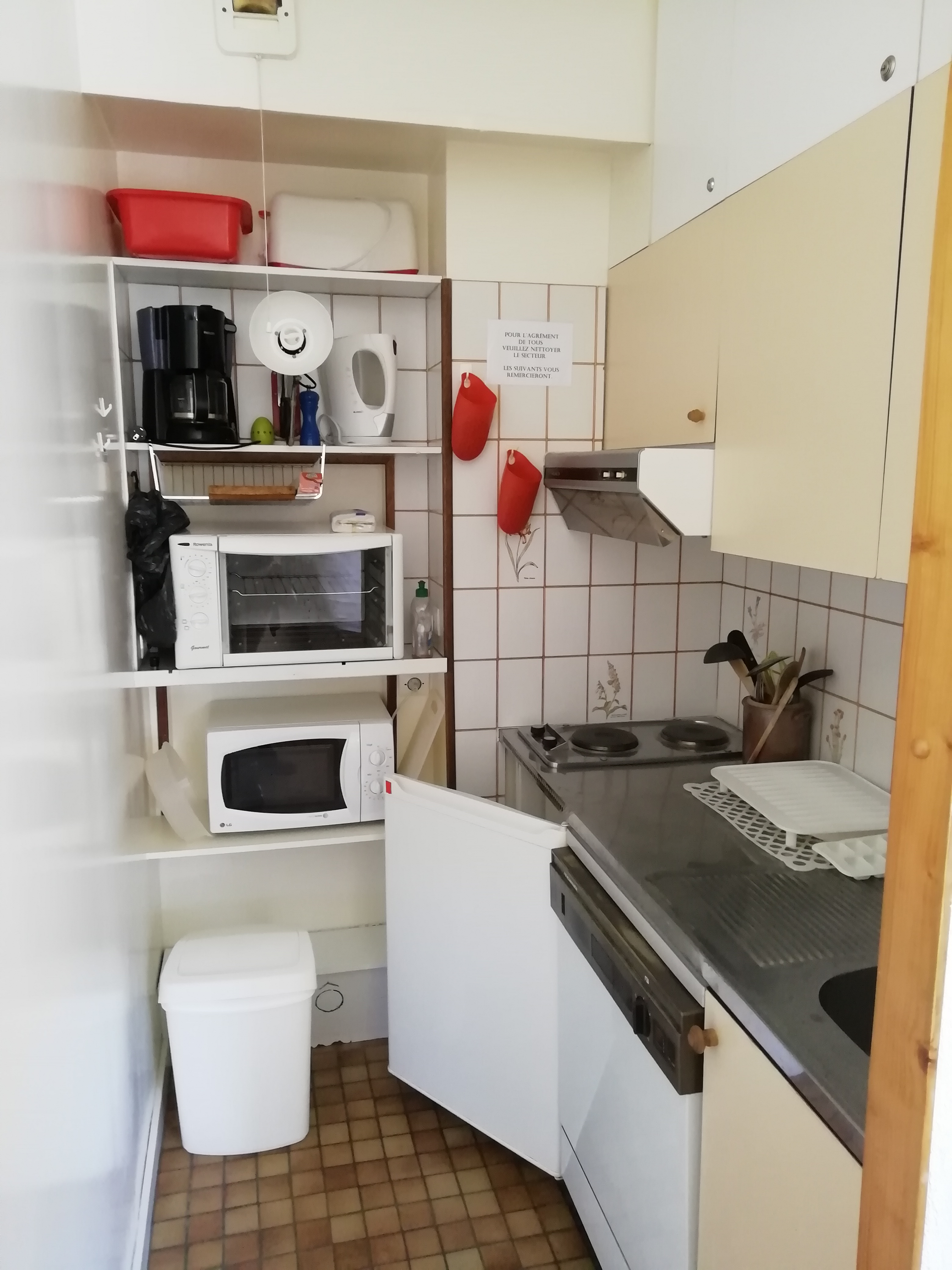 Cuisine équipé de plaques électriques, lave-vaisselle, frigo avec compartiment congélateur, micro-ondes , mini-four, ainsi de vaisselles et d'ustensiles.
