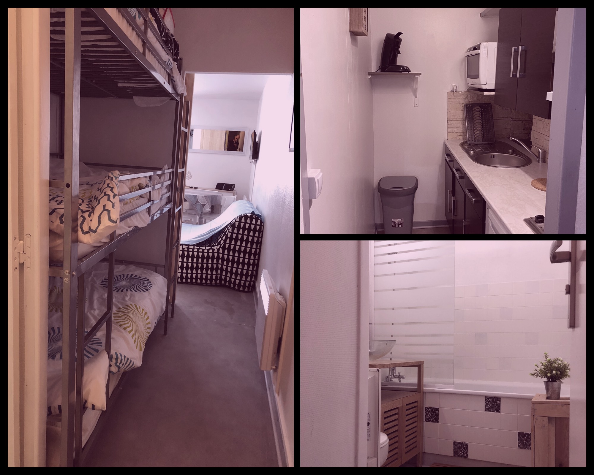 Alcôve à l'entrée avec 3 lits superposés avec porte coulissante (afin de créer une séparation avec le salon) et tv avec lecteur dvd.