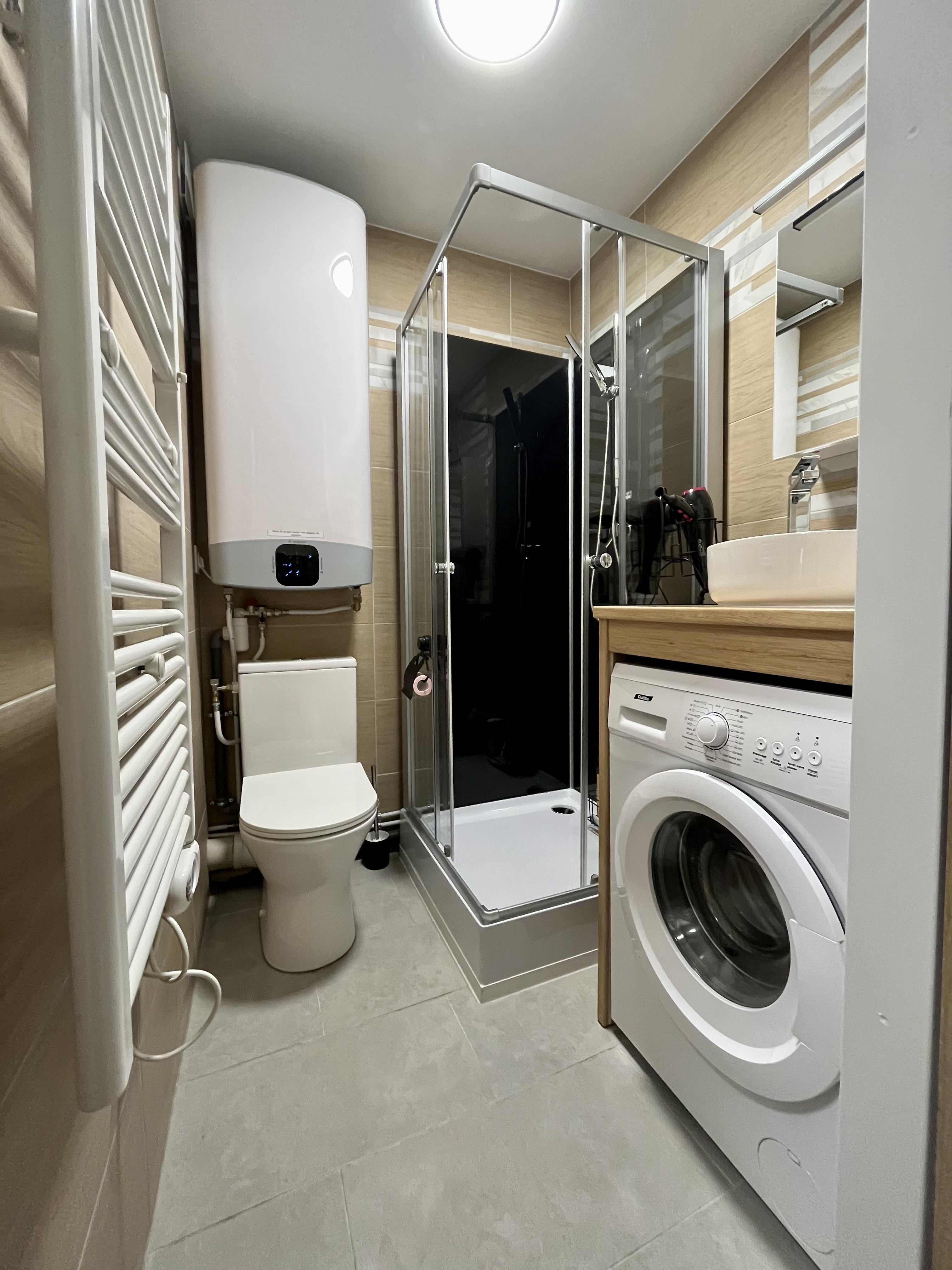 Une salle de bain avec douche, WC, machine à laver le linge et sèche cheveux.