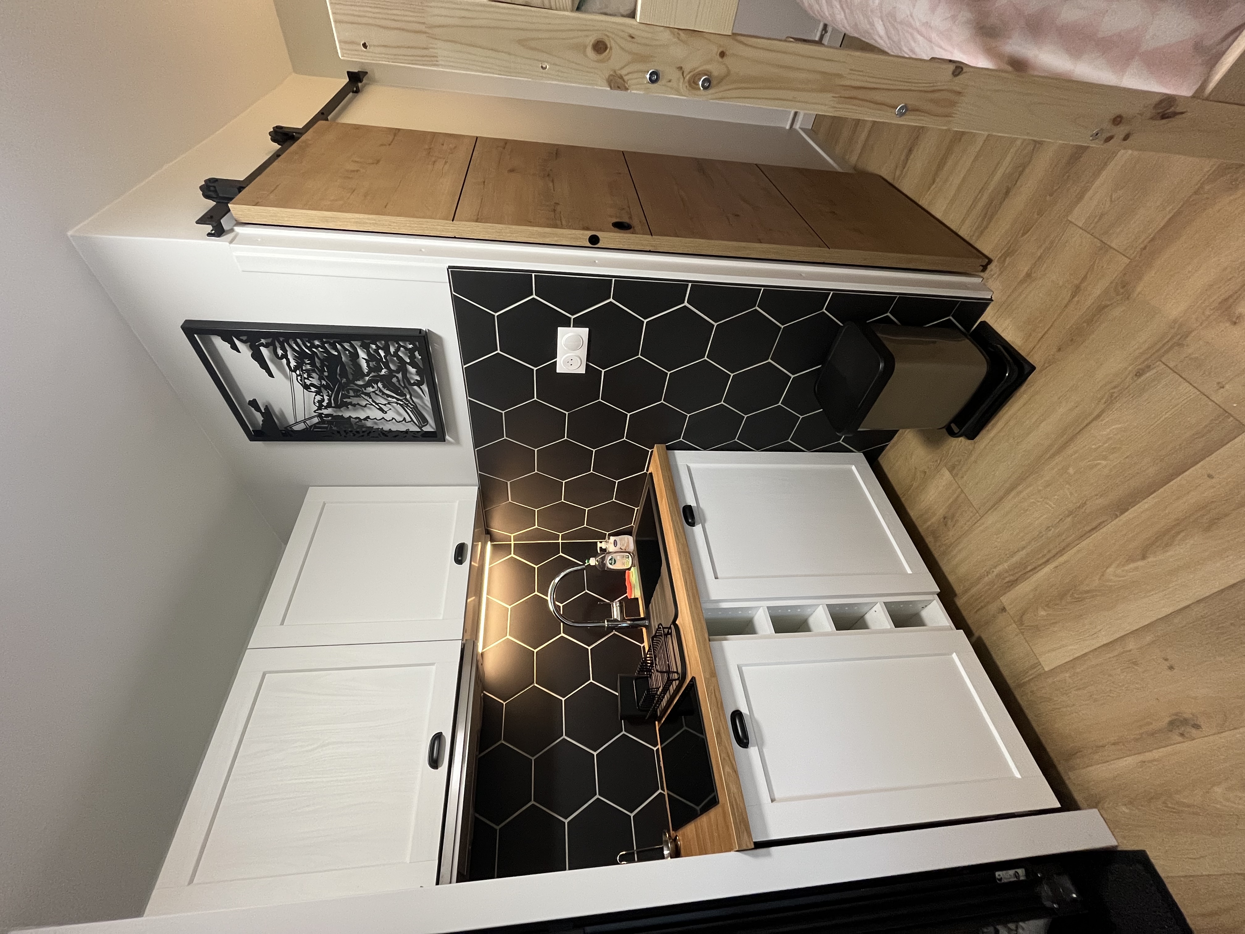 Un coin cuisine avec lave vaisselle, four, micro onde, service à raclette et service à fondue, machine à café Dolce Gusto, grille pain, bouilloire.