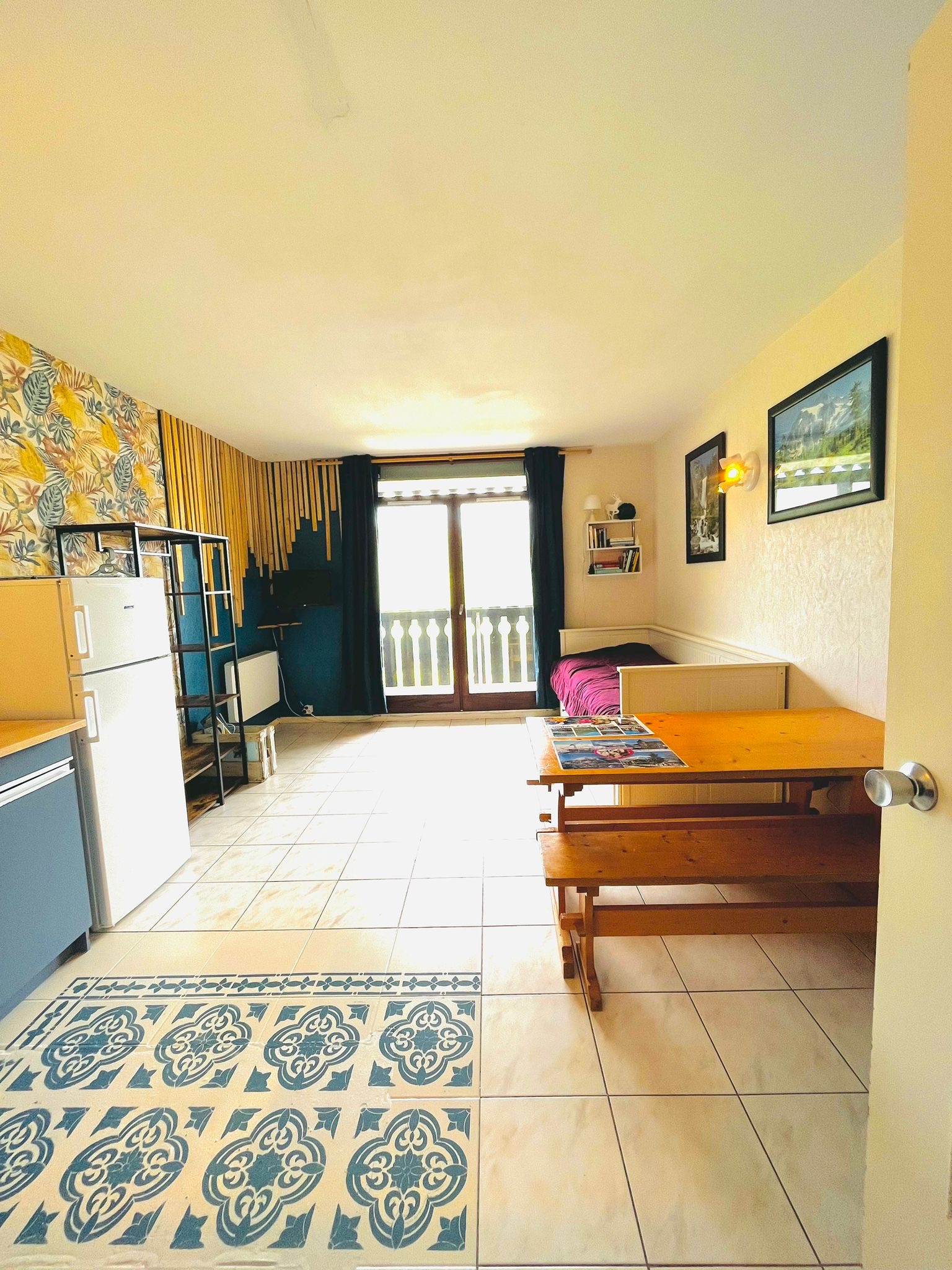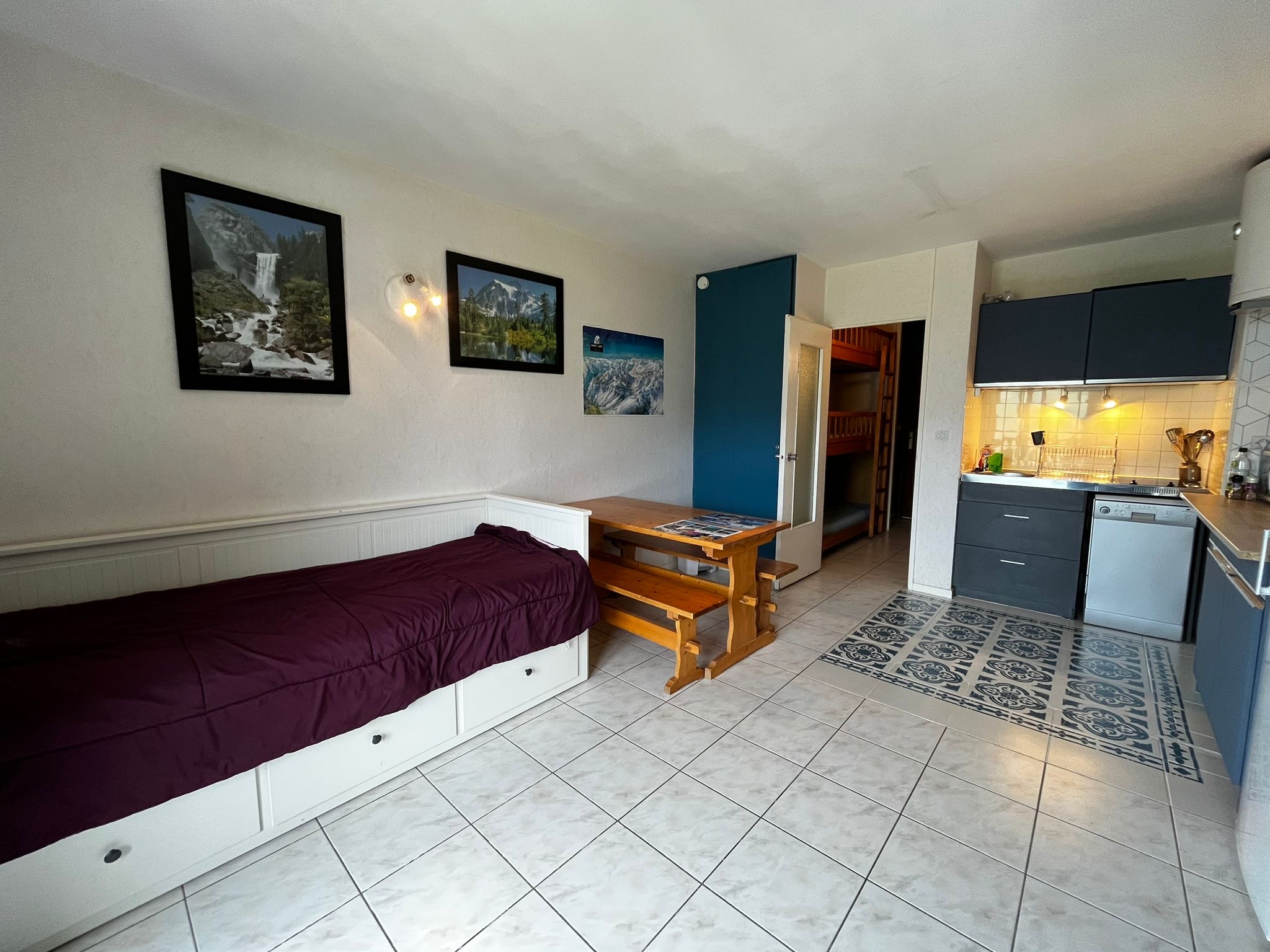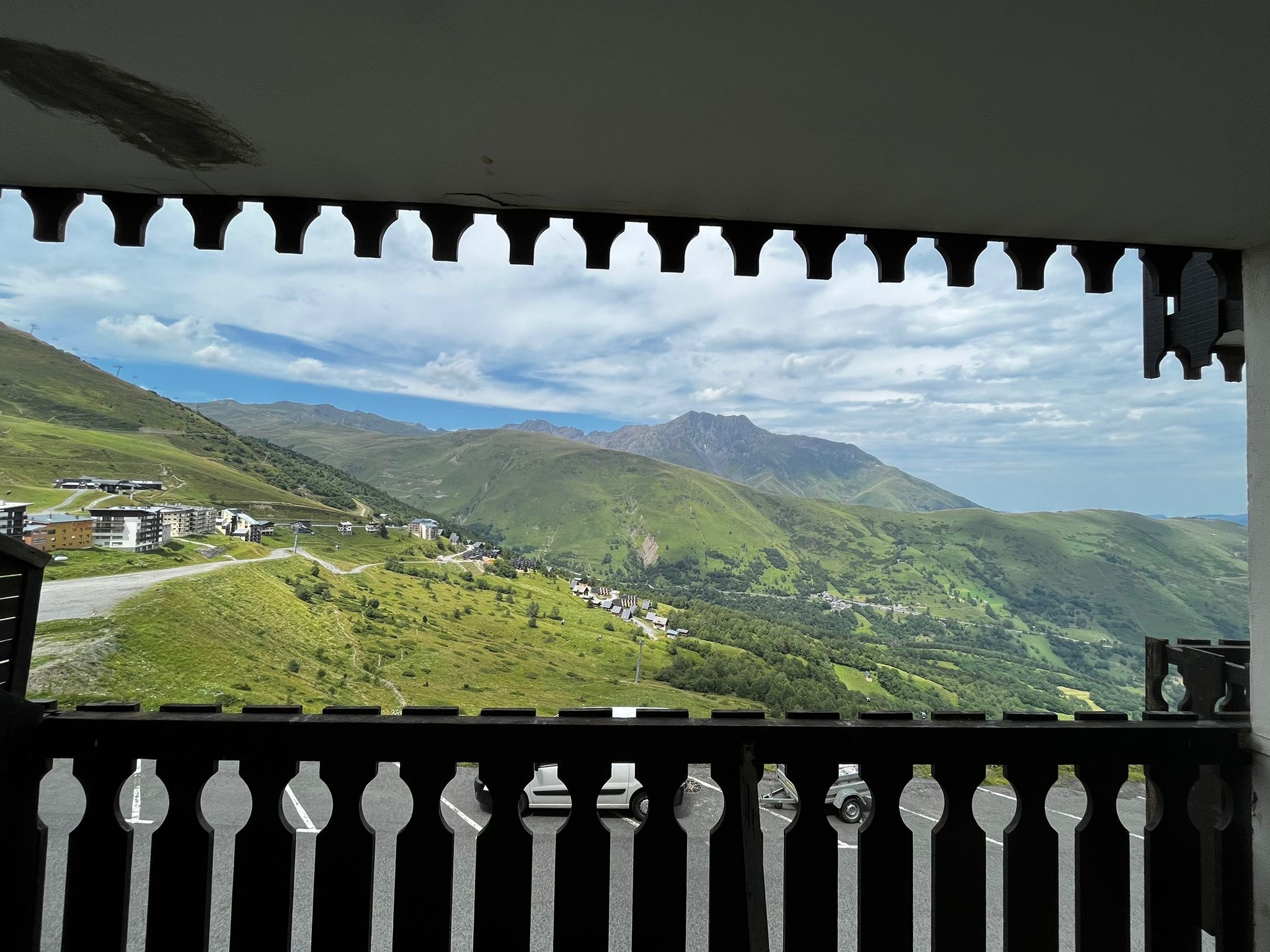Studio cabine avec vue.L’appartement est composé d’une entrée desservant un couloir avec trois couchages superposés, salle de bain et ensuite on entre dans la pièce de vie avec une cuisine ouverte sur son salon et son couchage composé d’un canapé qui une fois ouvert est un lit de 180 (2 laureles de 90) pièce lumineuse grâce a sa terrasse donnant une vue imprenable sur les vallées et les pistes.